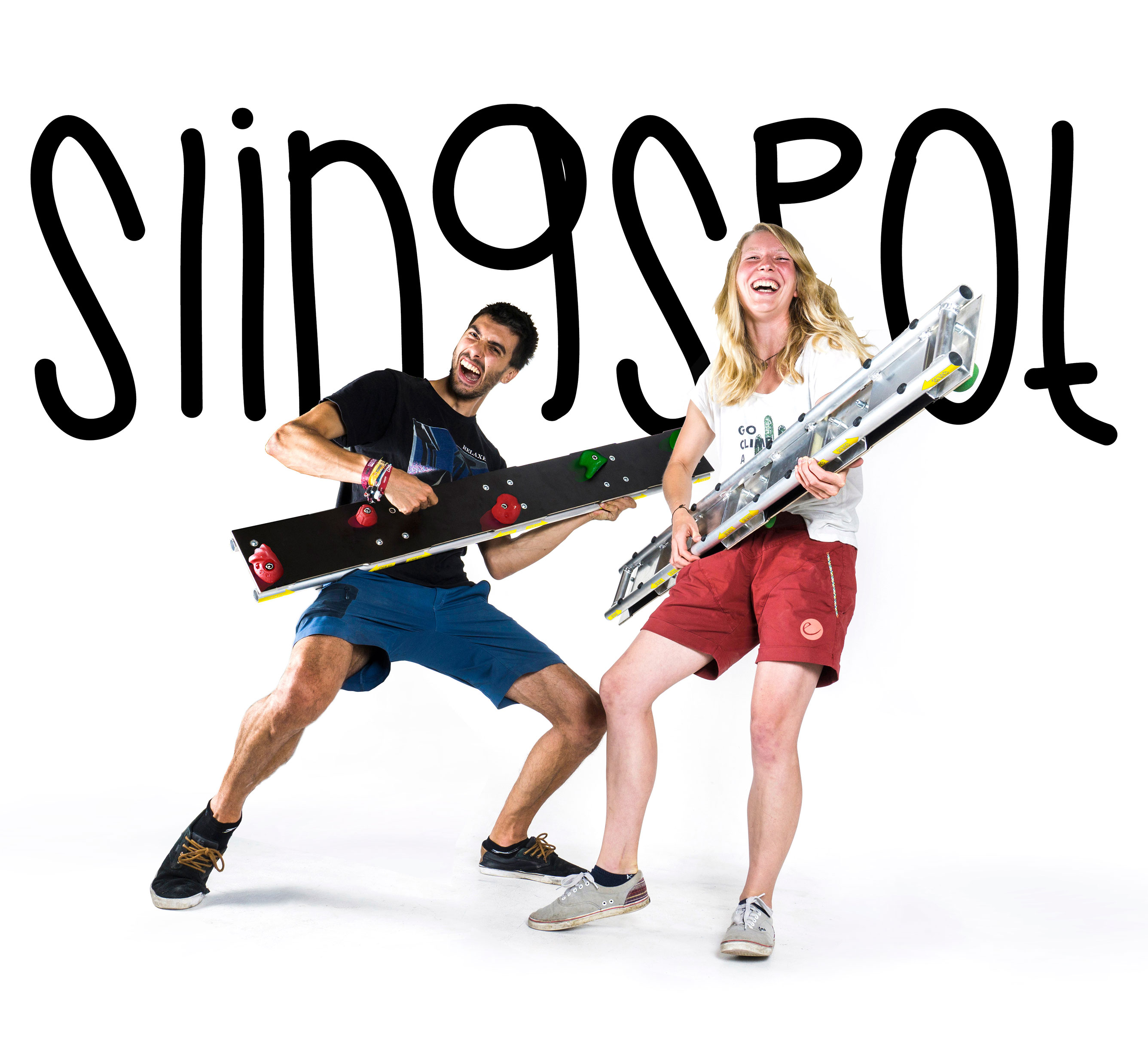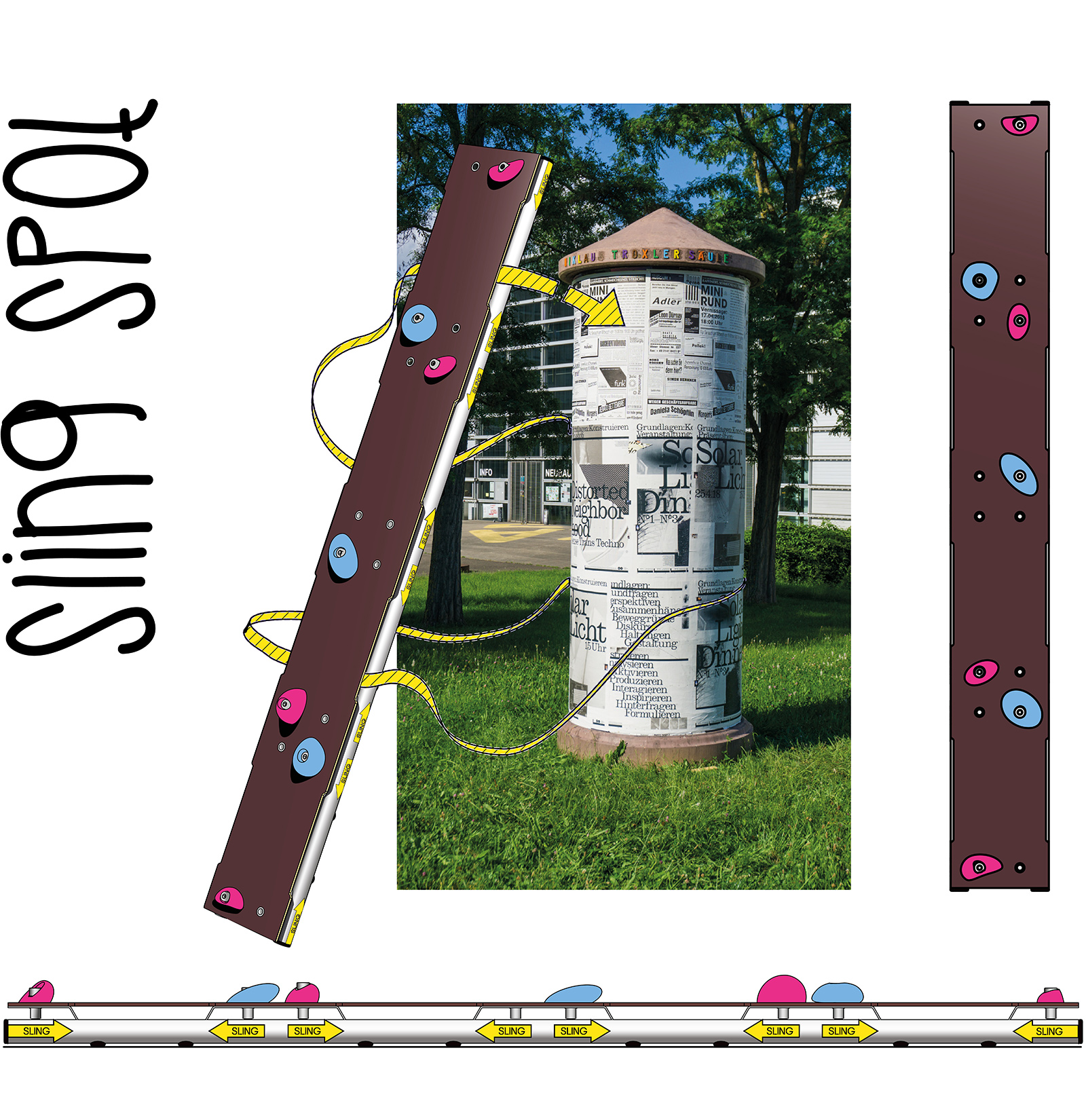 Als flexibles und reversibles Befestigungsmittel kamen mir Spanngurte in den Sinn, im Sportgeräte-Kontext auch vom Slacklinen bekannt. Damit lassen sich vorgefundene Strukturen aller Art bestens einfangen. Als Träger für die zu ergänzenden Klettermöglichkeiten dient eine dünne, und wetterfest beschichtete Sperrholzplatte – im Verbund mit einem abgekanteten Aluminiumprofil. Griff- und Trittmöglichkeiten werden zum Beispiel mit konventionellen Klettergriffen hergestellt, im Prototyp angebunden in einem Raster aus Aluminium-Einnietmuttern. Dadurch bleibt Sling Spot jederzeit flexibel und an wechselnde Anforderungen anpassbar.