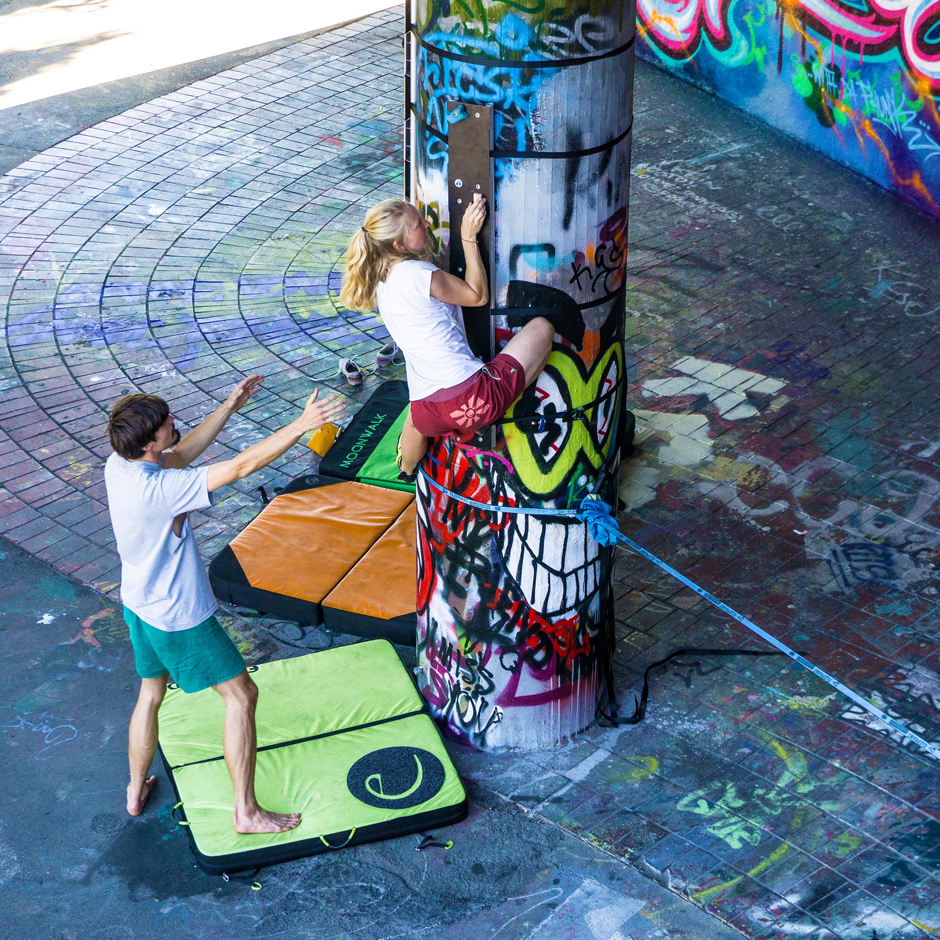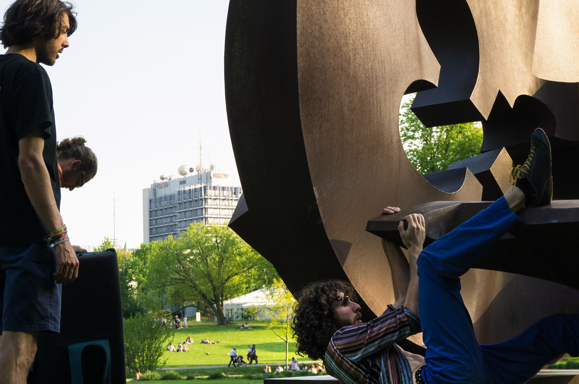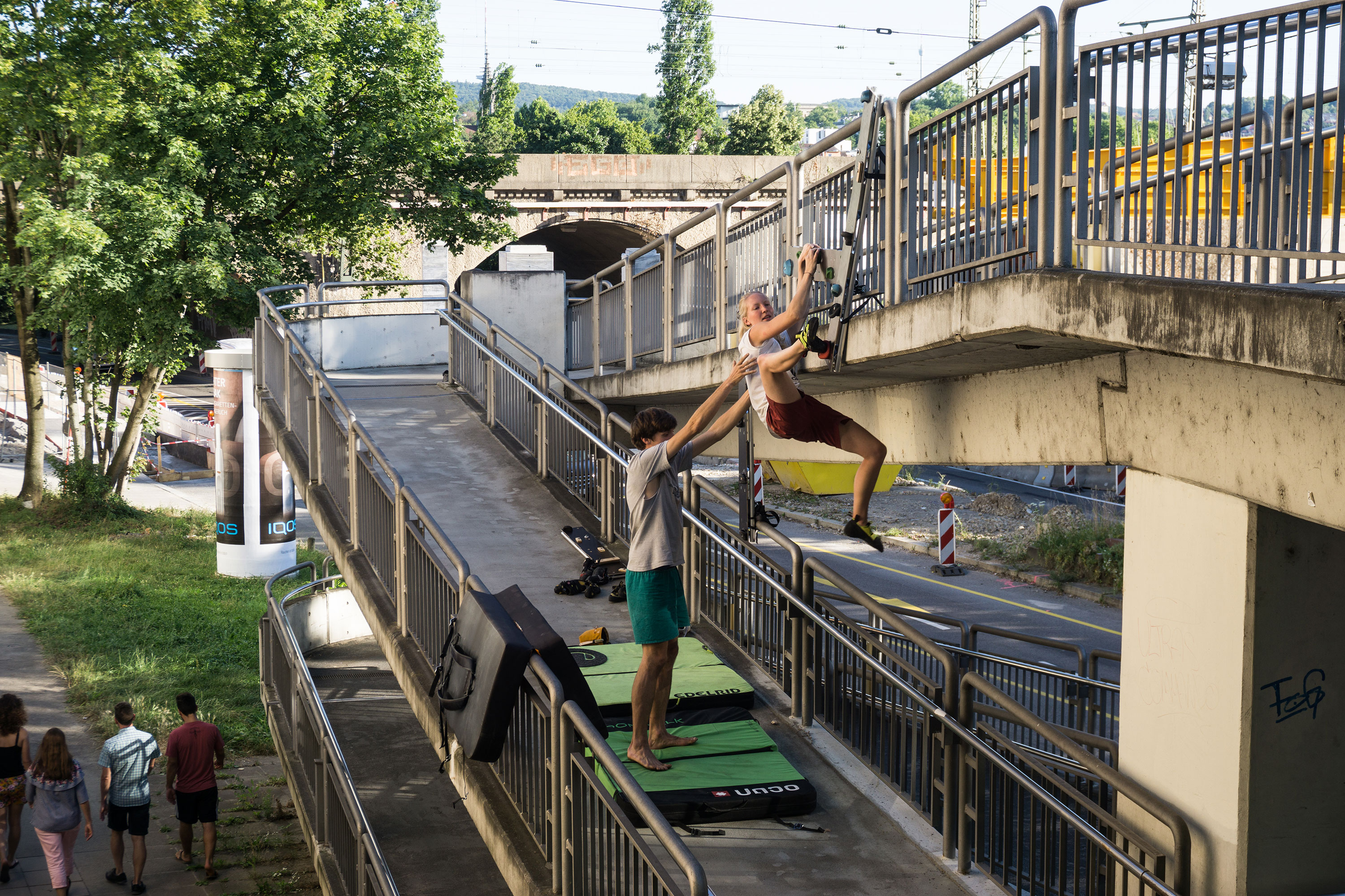 Anders, als beim Besuch einer Boulderhalle, in der alles extra für‘s Bouldern gemacht ist, Routen extra geschraubt und mit einem Farbcode schnell erkennbar markiert, anders als „inside the box“ galt es im freien, öffentlichen Raum auf einmal wieder selbst kreativ zu sein. Die Umgebung mit neuen Augen zu betrachten und sie zum Spielen umzunutzen.